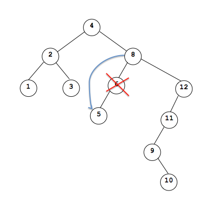 Now, Lets remove the node 6 which has only a left child but no right child. This is also easy. all we need to do is make the pointer from the parent node point to the left child.