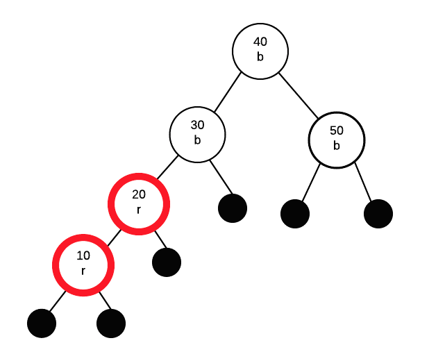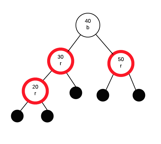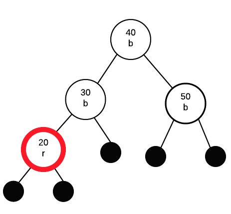 Insert 50 as a red node, parent is black so we don't have to change anything