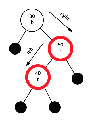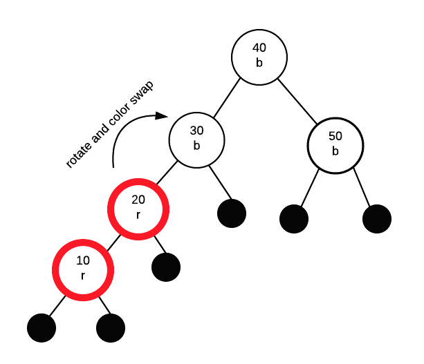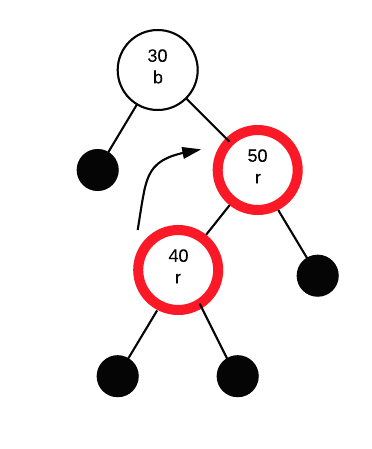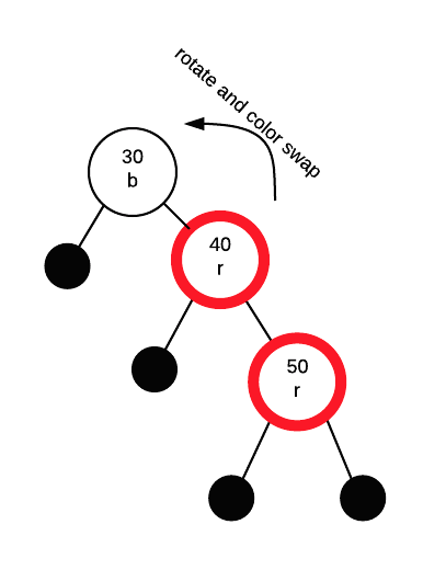 After rotations are complete, we exchange the colour between the node that took over G's spot (40 in this case) and G. Thus, 40 becomes black and 30 becomes red.